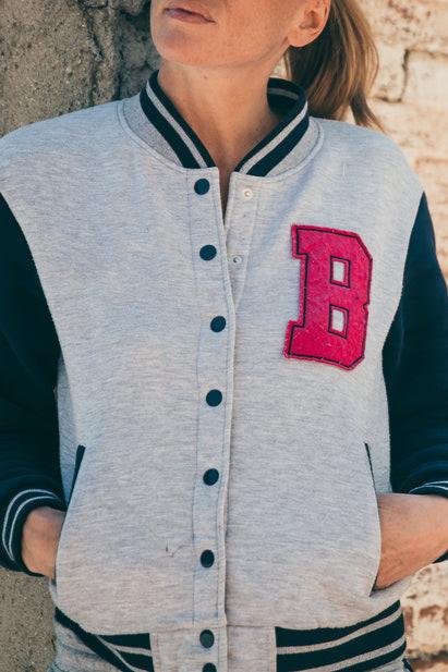 Womens casual varsity top, This grey and black buttoned top is a sport-inspired piece complete with an embroidered letter.