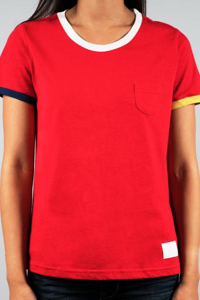 Women's red sporty t-shirt with colorful details on the sleeves and a small white pocket.