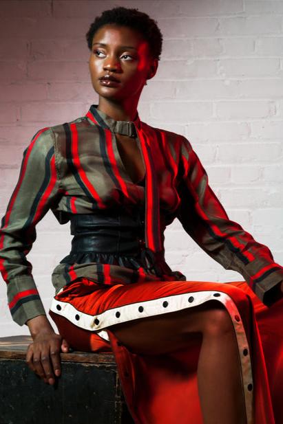 Ultra-stylish black and red striped silk blouse with buckle collar and matching button pants.